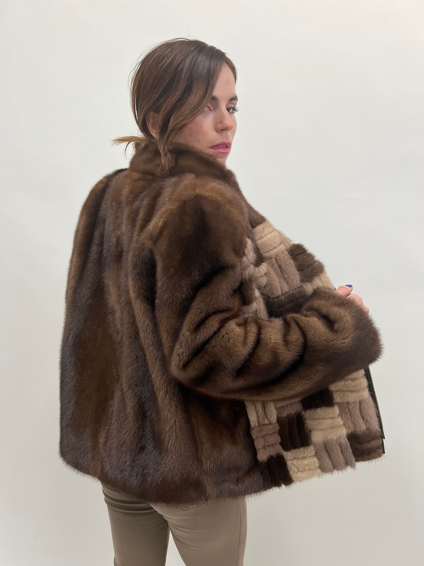 Beautiful Intarsia brown mink fur collared jacket.Saga Lightweight unique style brown supple mink full skin zip coat. Affordable luxury fur gift.
