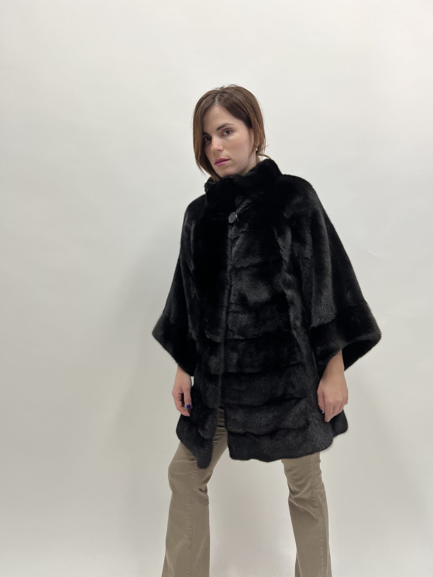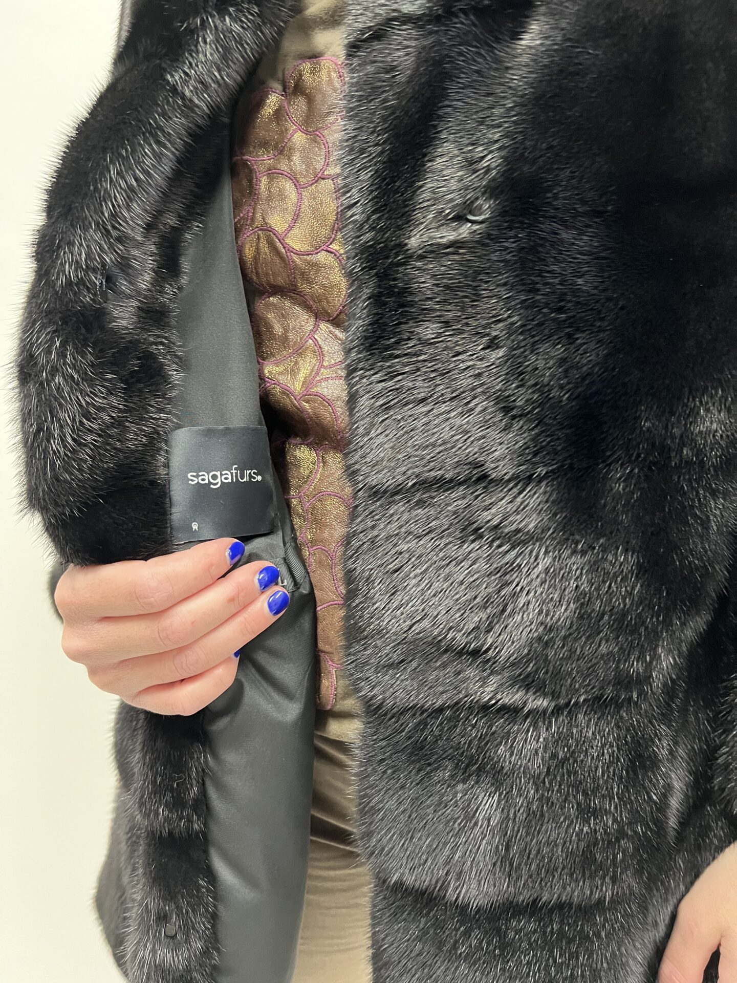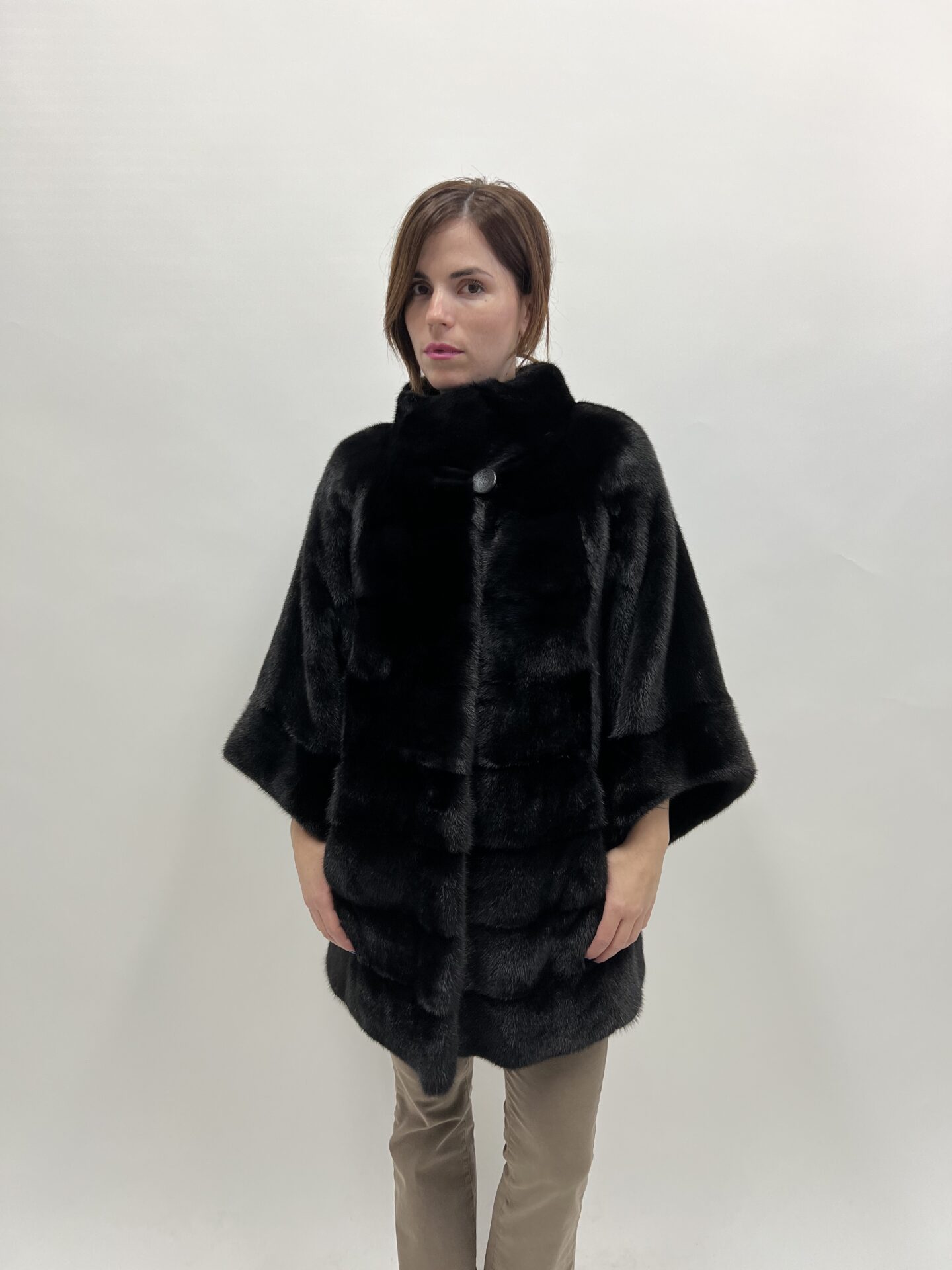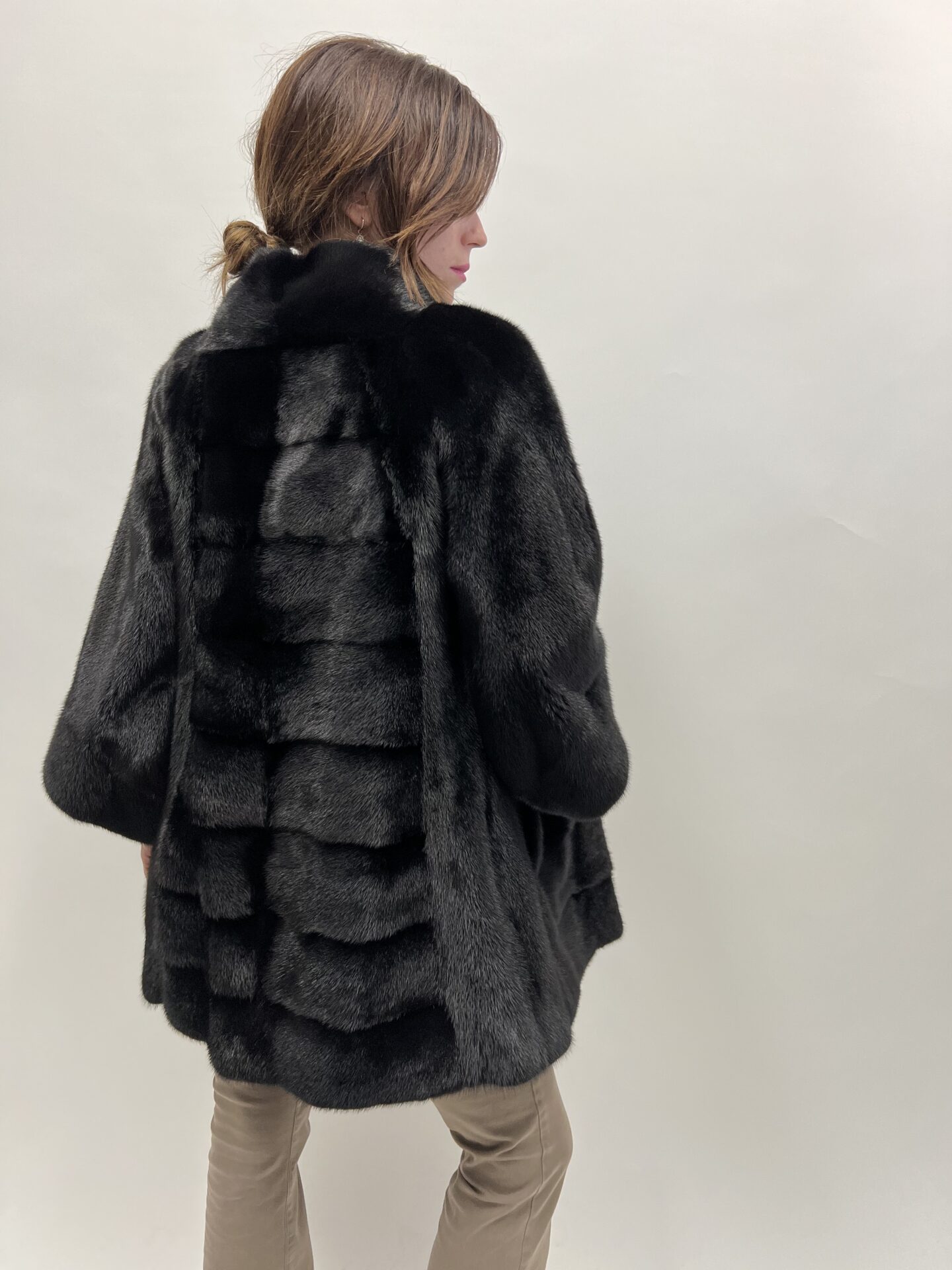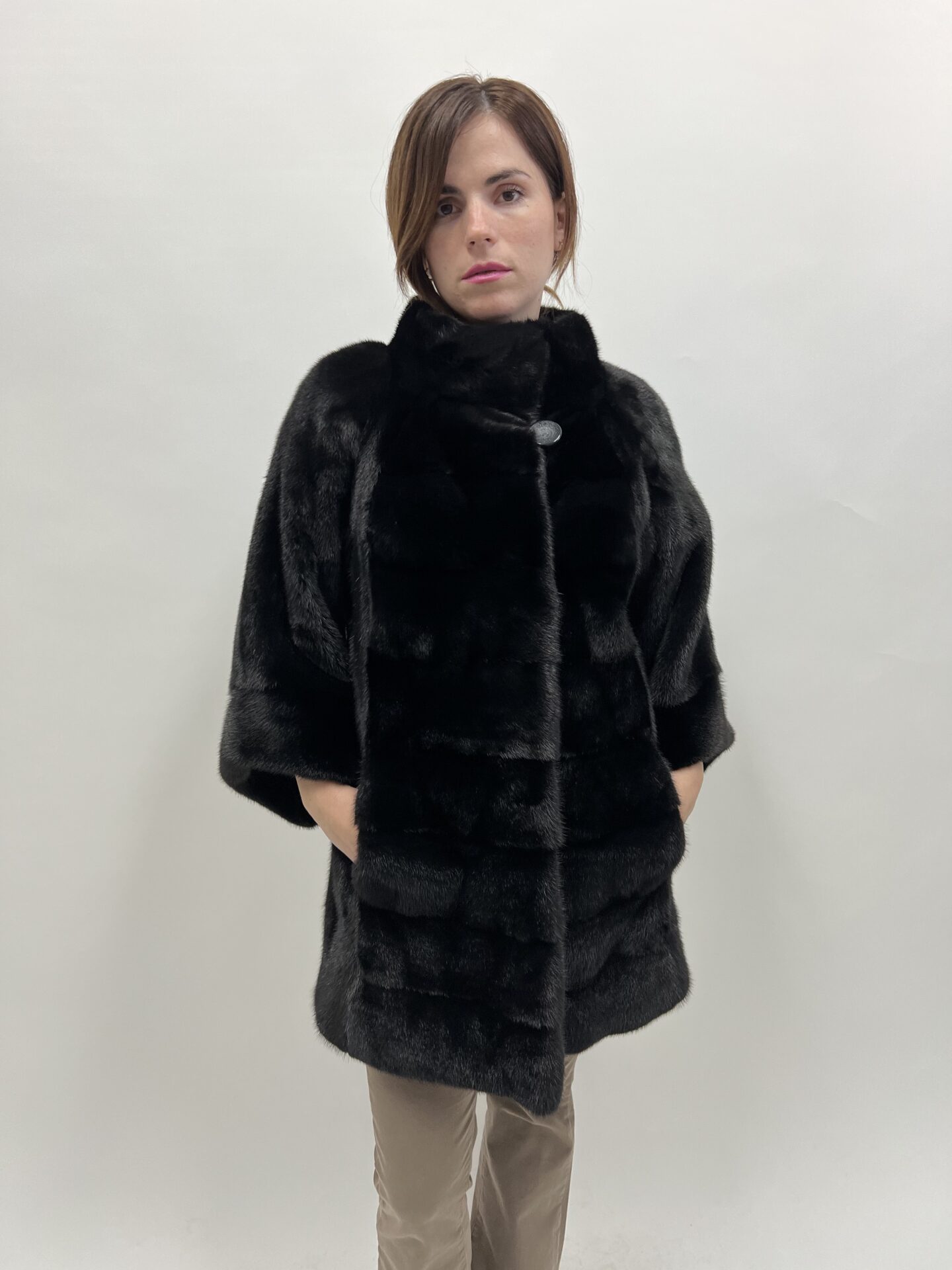 Real mink fur horizontal collared coat,Saga lavish black supple mink fur assured jacket with diagonal sleeves. Affordable luxury fur gift.