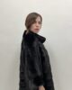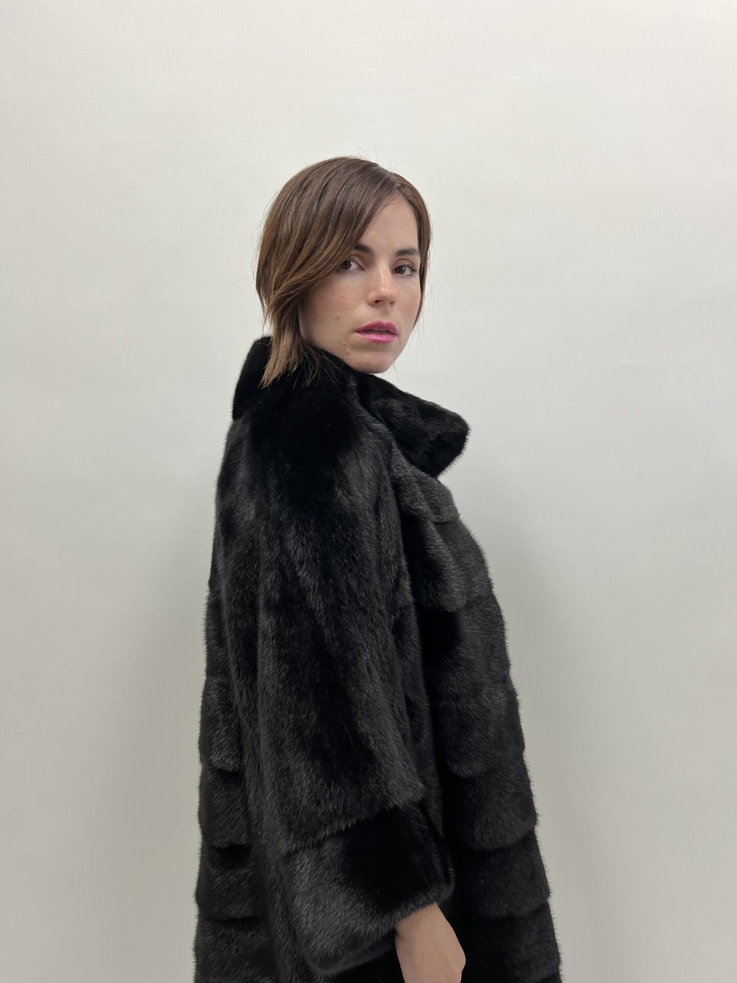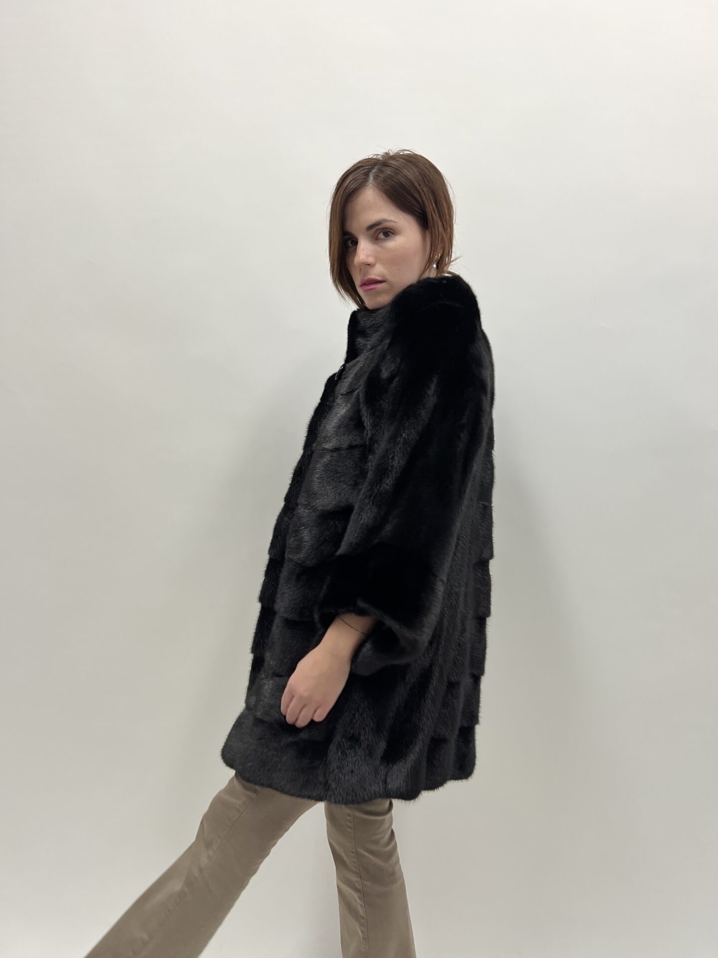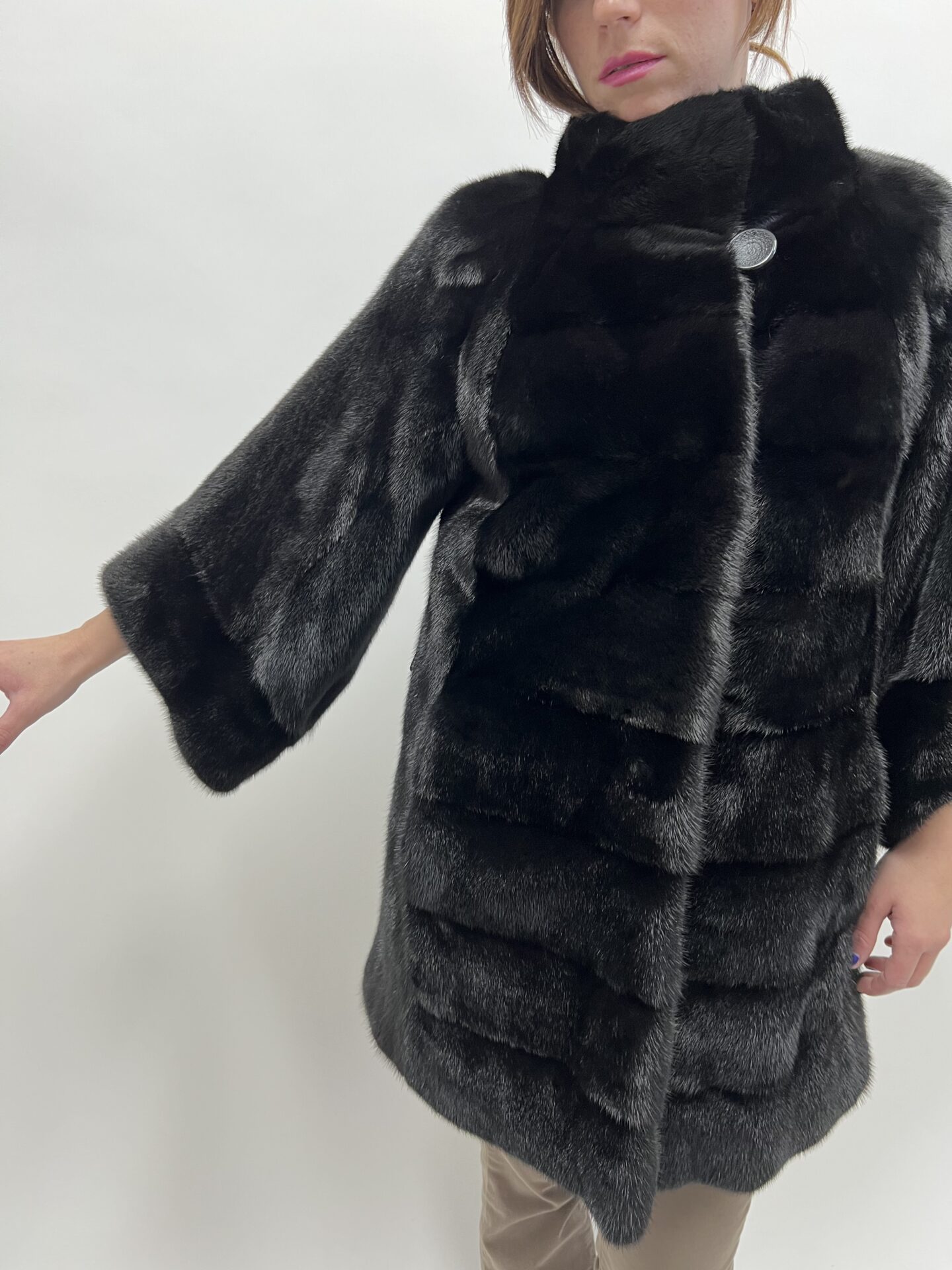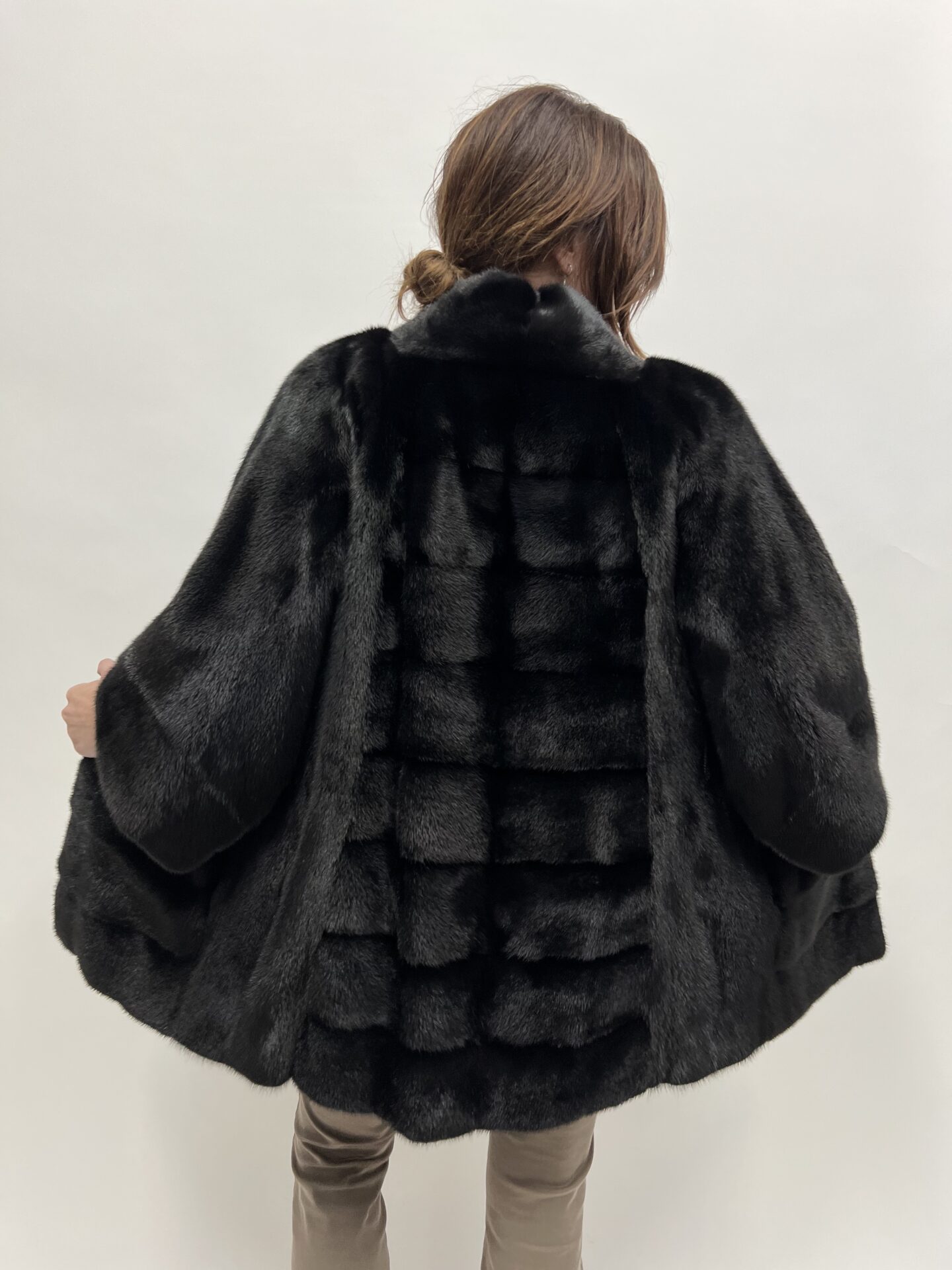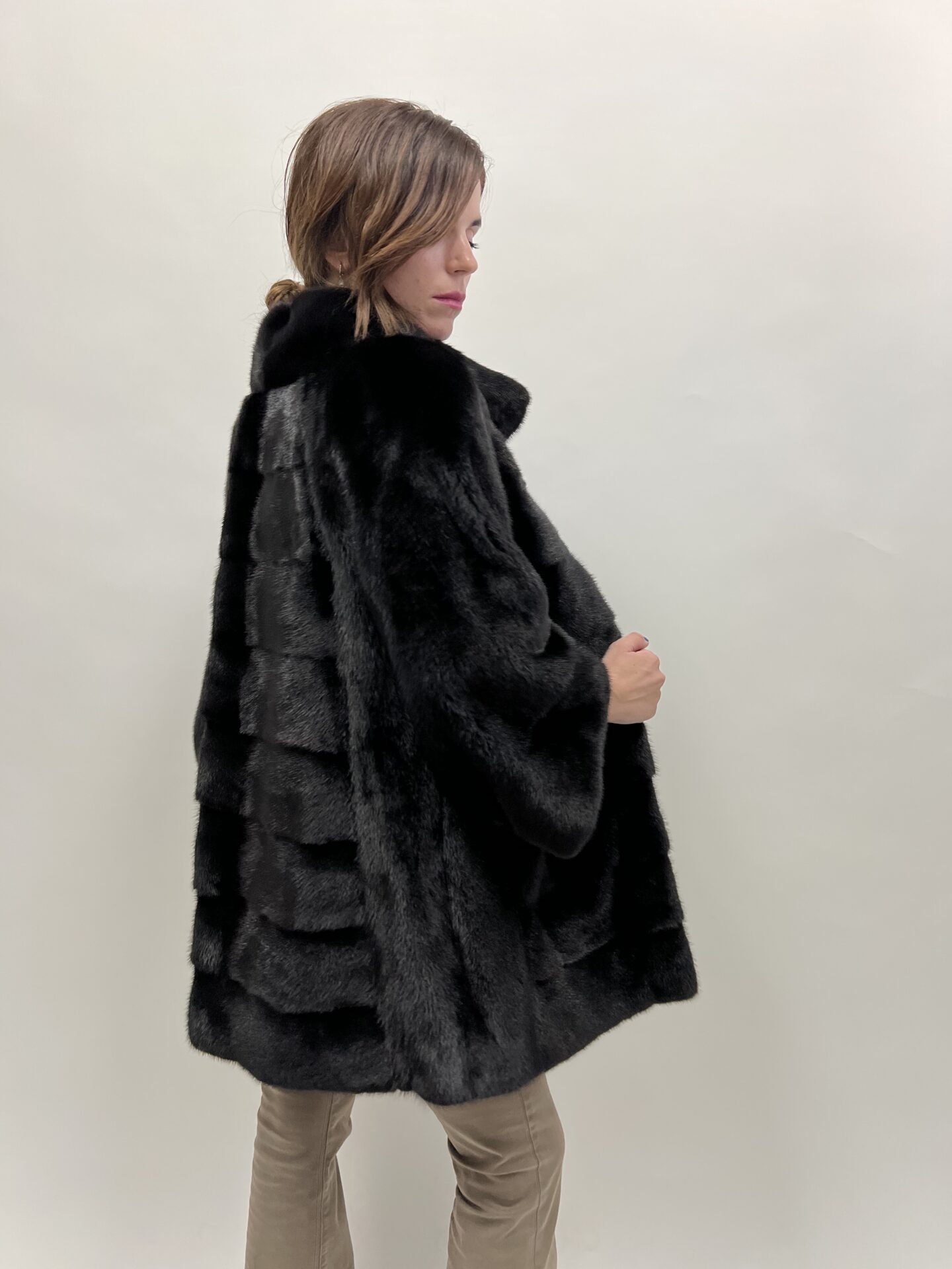 Real mink fur horizontal collared coat,Saga lavish black supple mink fur assured jacket with diagonal sleeves. Affordable luxury fur gift.