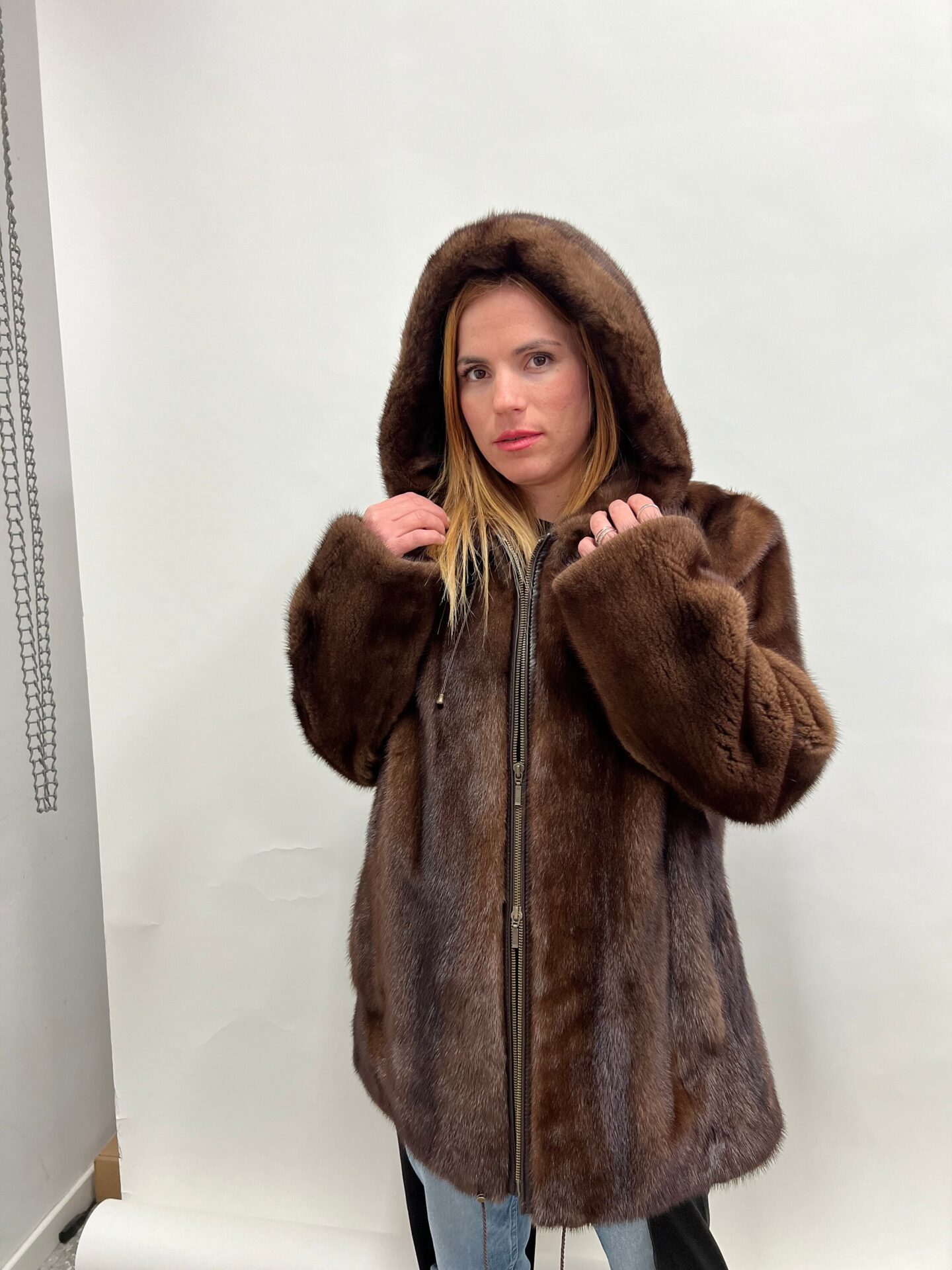 Real brown mink hooded jacket,Saga furs Demi buff straight line jacket let out with zip closure . Practical and affordable real fur in a budget.