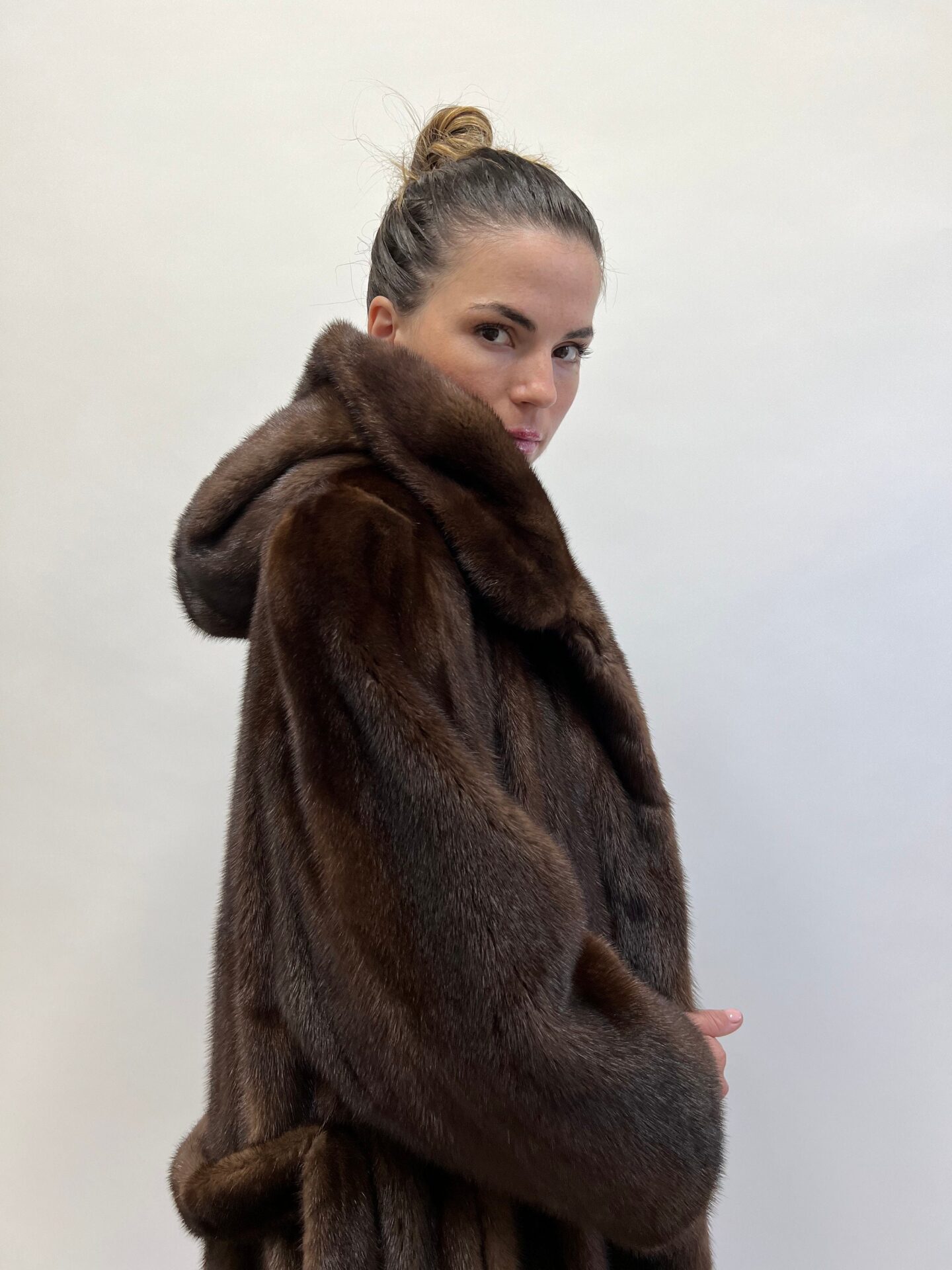 Real brown mink premium lavish mink fur long hooded coat in supple Demi buff pelts with belt. Stunning let out stroller.Luxury gift for her.