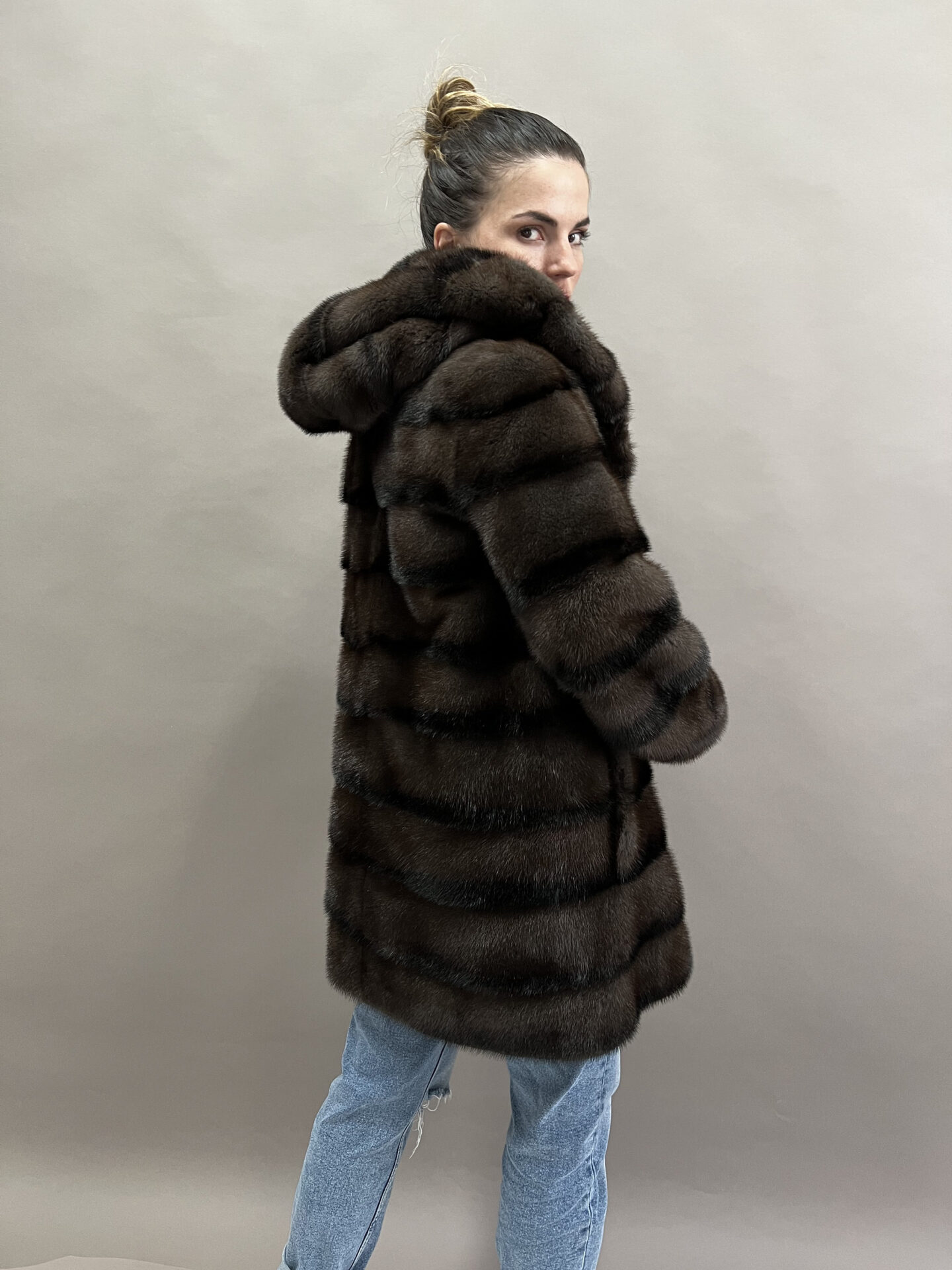 Real brownish mink fur horizontal hooded coat, lavish supple Aurora mink fur coat with stripe. Super warm full skin fur jacket.Luxury fur gift.