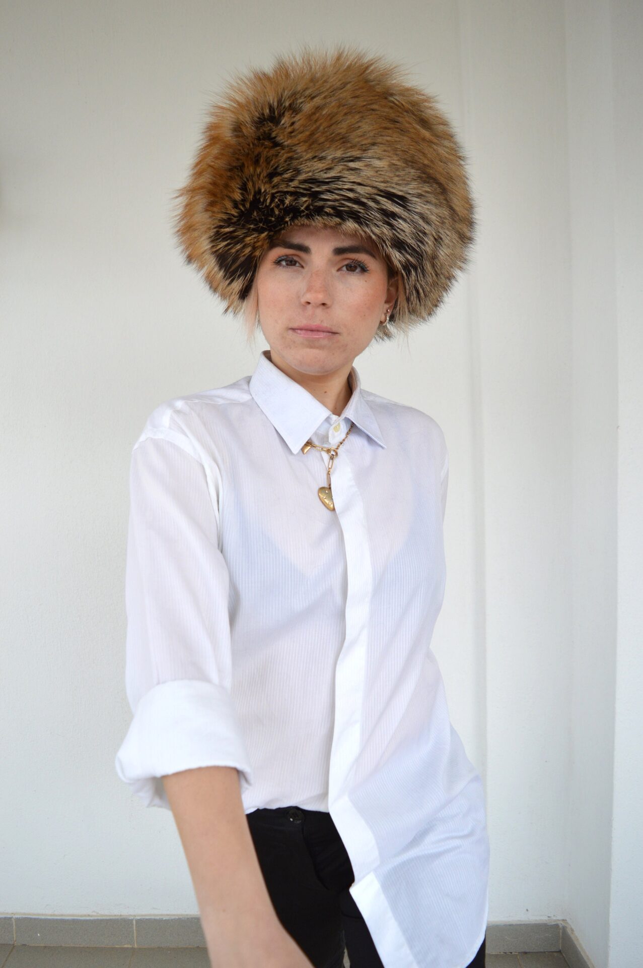 Real golden fox fur hat in tan brown Russian Cossack winter fur hat with padded lining made from full skin, head fur warmer.Luxury fur gift.