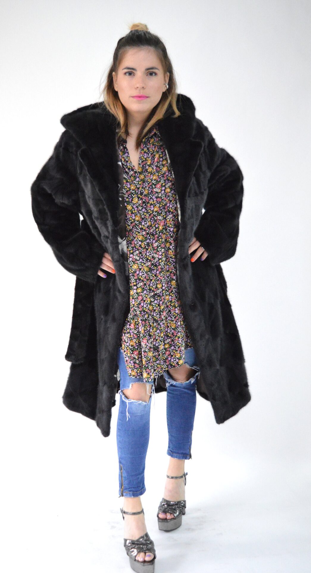 Real graphite gorgeous mink fur stroller with mink hood and notch collar. Genuine mink fur coat with fur belt, luxury fur farming pelts.