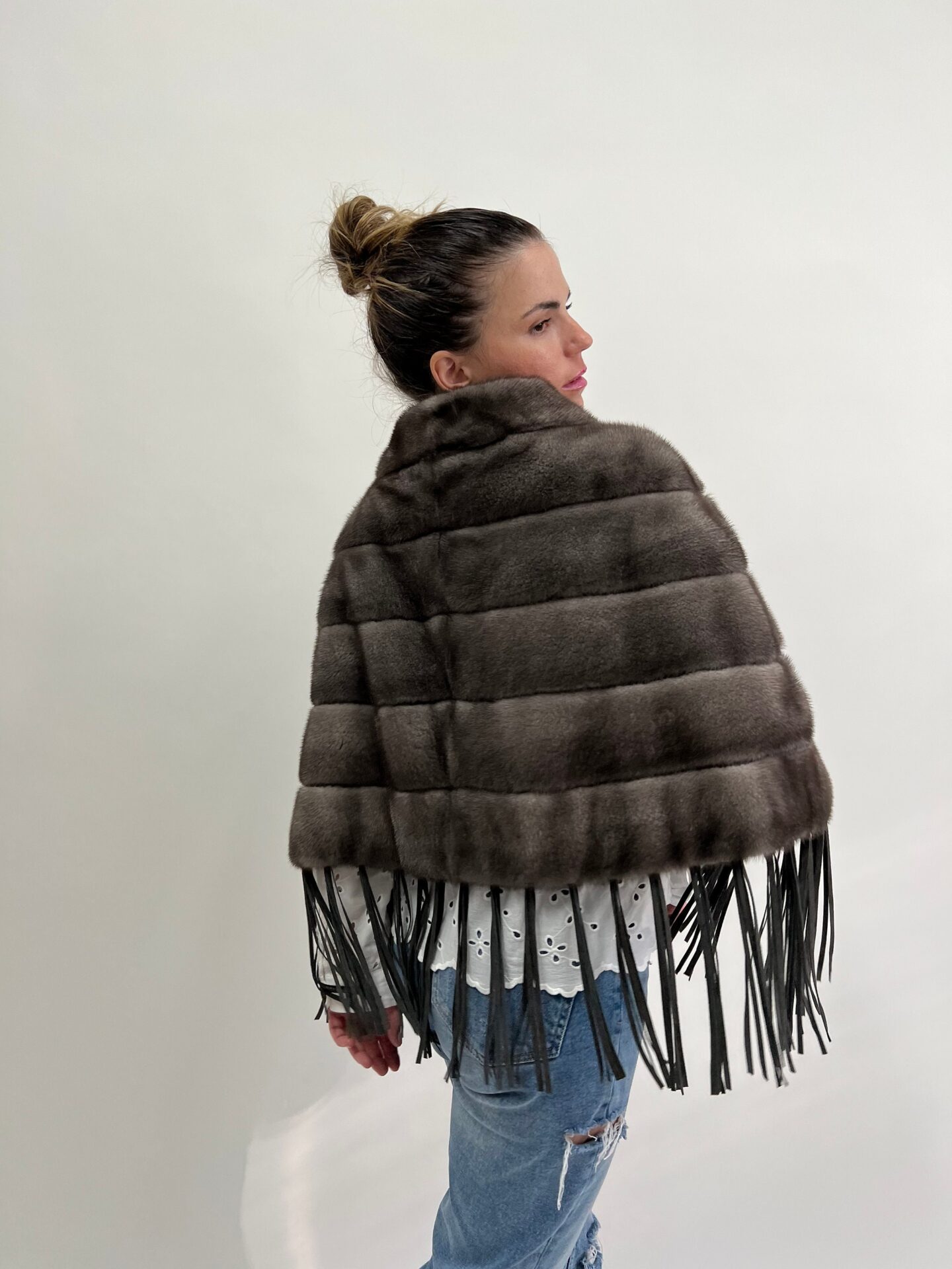 Real grey mink fur poncho with leather tassel , one size stylish cape from saga blue iris fur. Luxury gift for her.