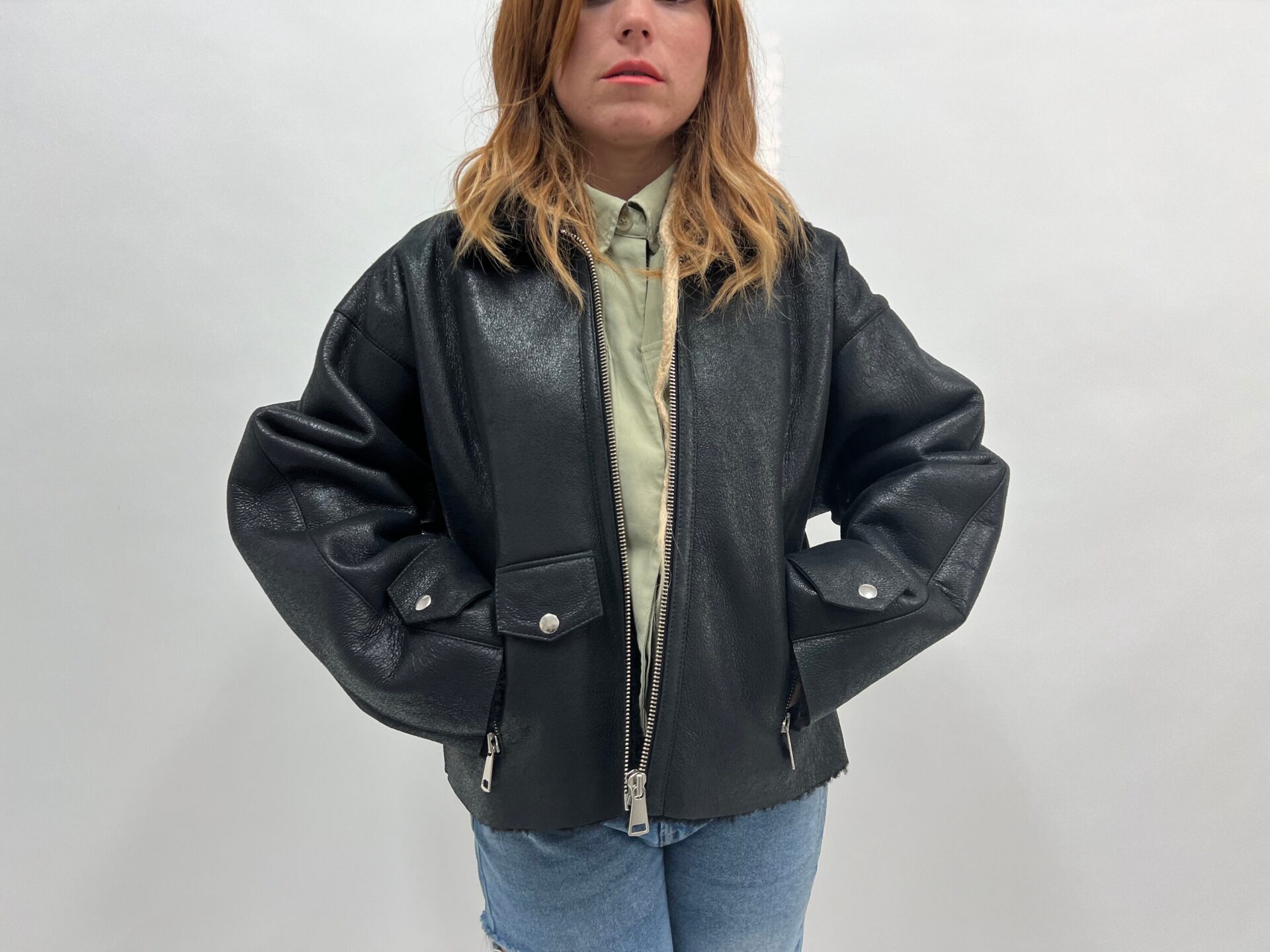 Real sheepskin black fur jacket with zippers.Extremely warm shearling fur cracked effect leather,modern and affordable luxury fur gift.