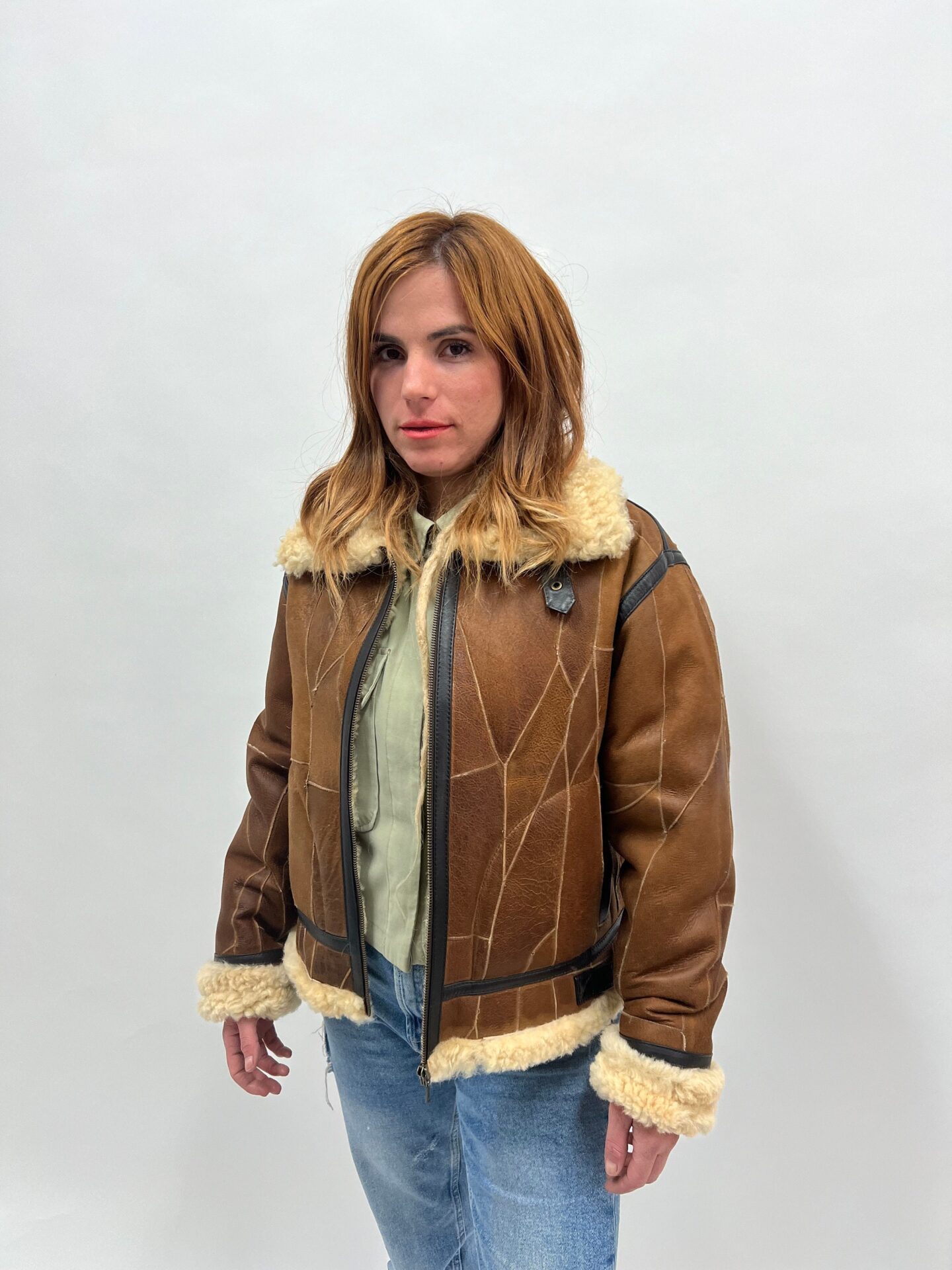 Real sheepskin sectional fur jacket with leather trims .Extremely warm shearling fur modern and affordable luxury fur gift.
