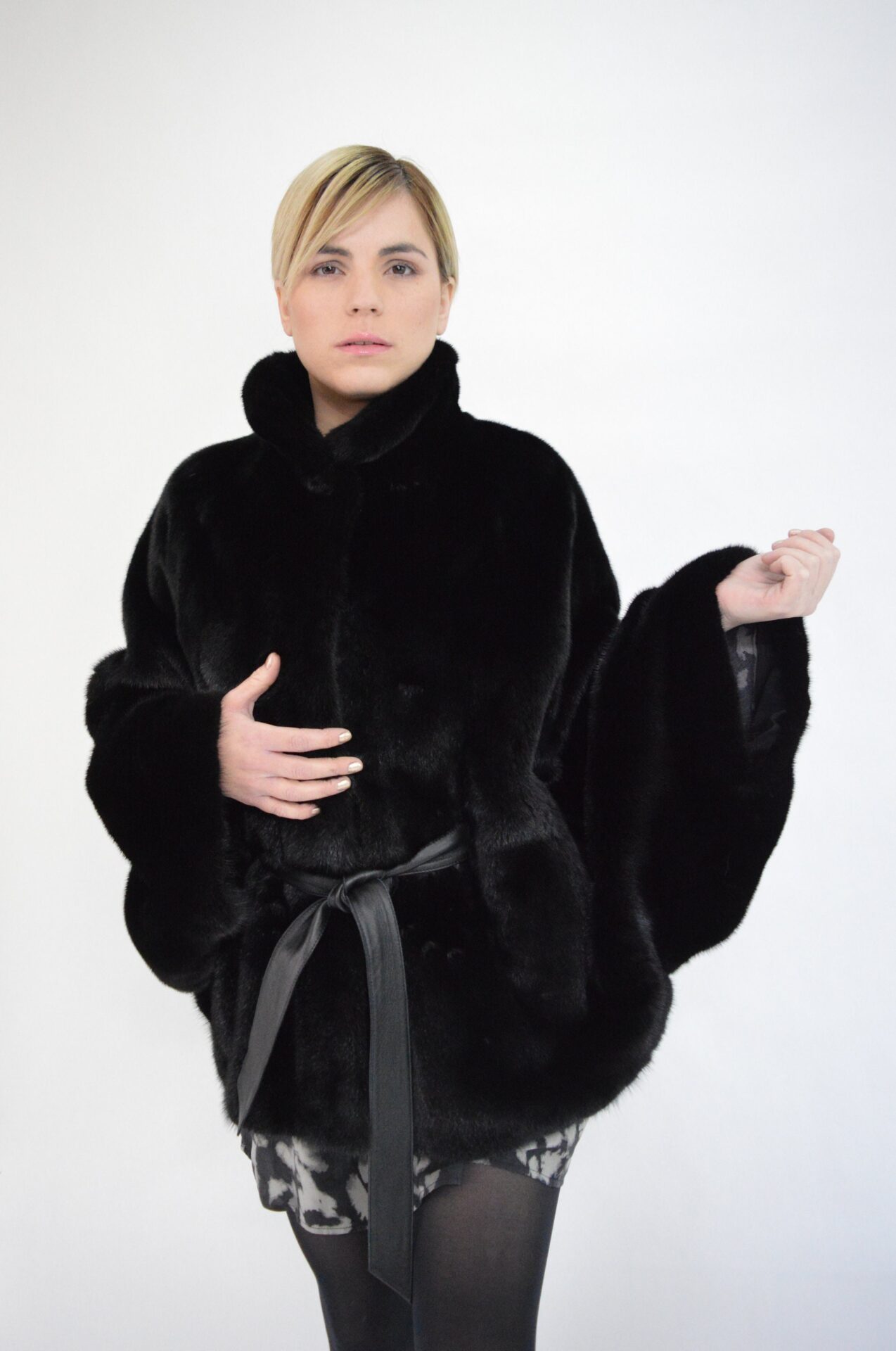 Excellent quality of luxury velvet male full skins in size 3.0 mink fur poncho with leather belt in black nappa..