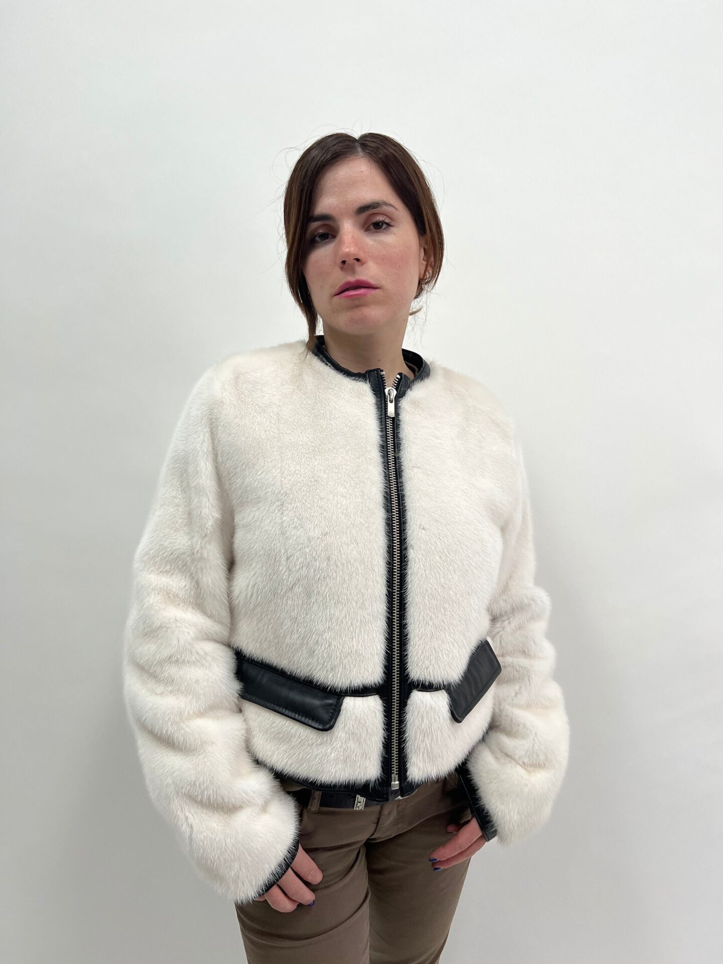 Real white fur mink short collarless jacket with leather details. Stylish and modern mink jacket. Lightweight and edgy mink Luxury fur gift.